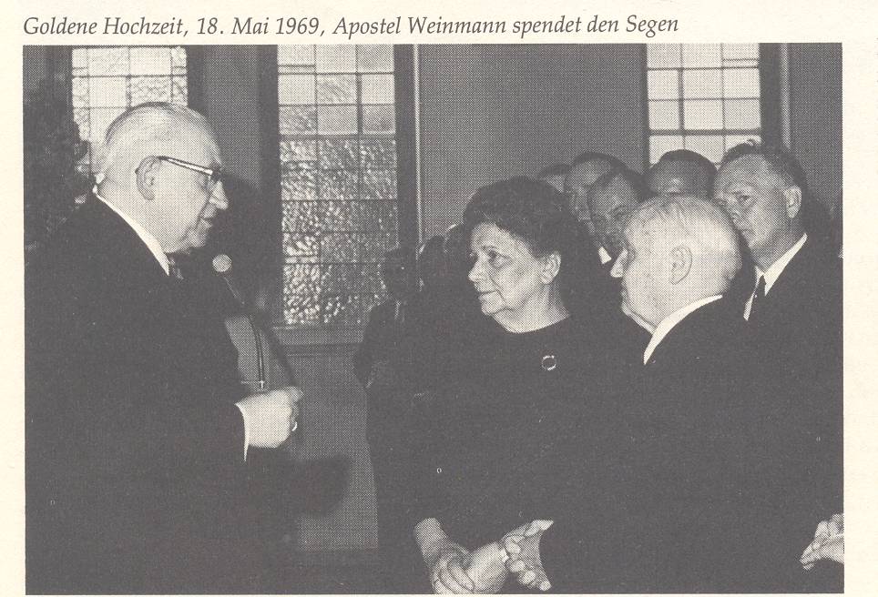 Aus Ihrer Ehe ist eine Tochter her vorgegangen, und Sie haben heute die Freude, neben der Tochter auf einen Schwiegersohn, auf drei Enkelkinder und zwei Gro1 sehen zu können und sich an dem Glück einer treuen neuapostolischen Familie zu freuen, und zwar nach dem Sinne des Liedes 345, in dem es heiilt: ,,O selig Haus, wo Mann und Weib in einer, in deiner Liebe eines Geistes sind!” Das Glück haben nicht alle, und darinnen sind auch der Stammapostel und seine Gattin uns em wunderbares Vorbild. Somit ist Gelegenheit gegeben, dali wir uns alle mit Ihnen über diesen Tag freuen können.